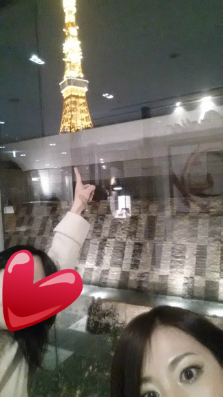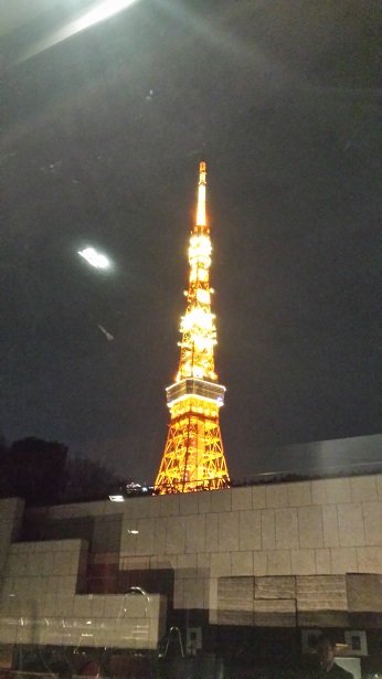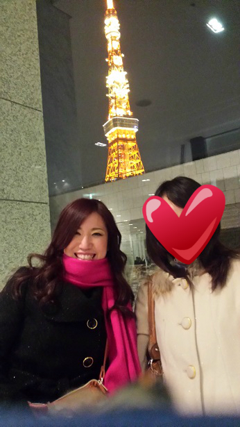 打ち上げ終えての帰り際、ガラス越しにライトアップされている東京タワーと一緒に記念撮影。