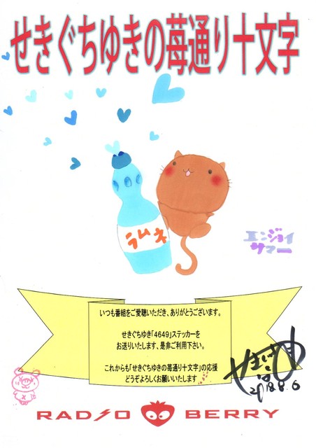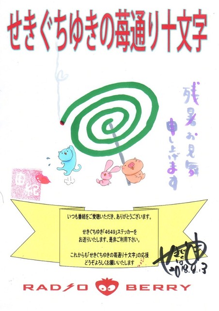 昨夜の「苺通り」聴いていましたよ、暑い中元気な ゆきさんの話し声と歌に癒されます。 イラスト ステッカー2枚「ラムネ」ハート入りと 「蚊取り線香」夏らしい 可愛い動物たちの楽しい笑顔 最高でーす また貴女の好きな「ワンカップを頂きながら 曲を書き」夏を静かにまんきっしていすネ・・・ そっくり、おかえしかしらへへへ(笑) 今日もあなたが元気でいますょうにと願う私でーす。 (*^_^*)